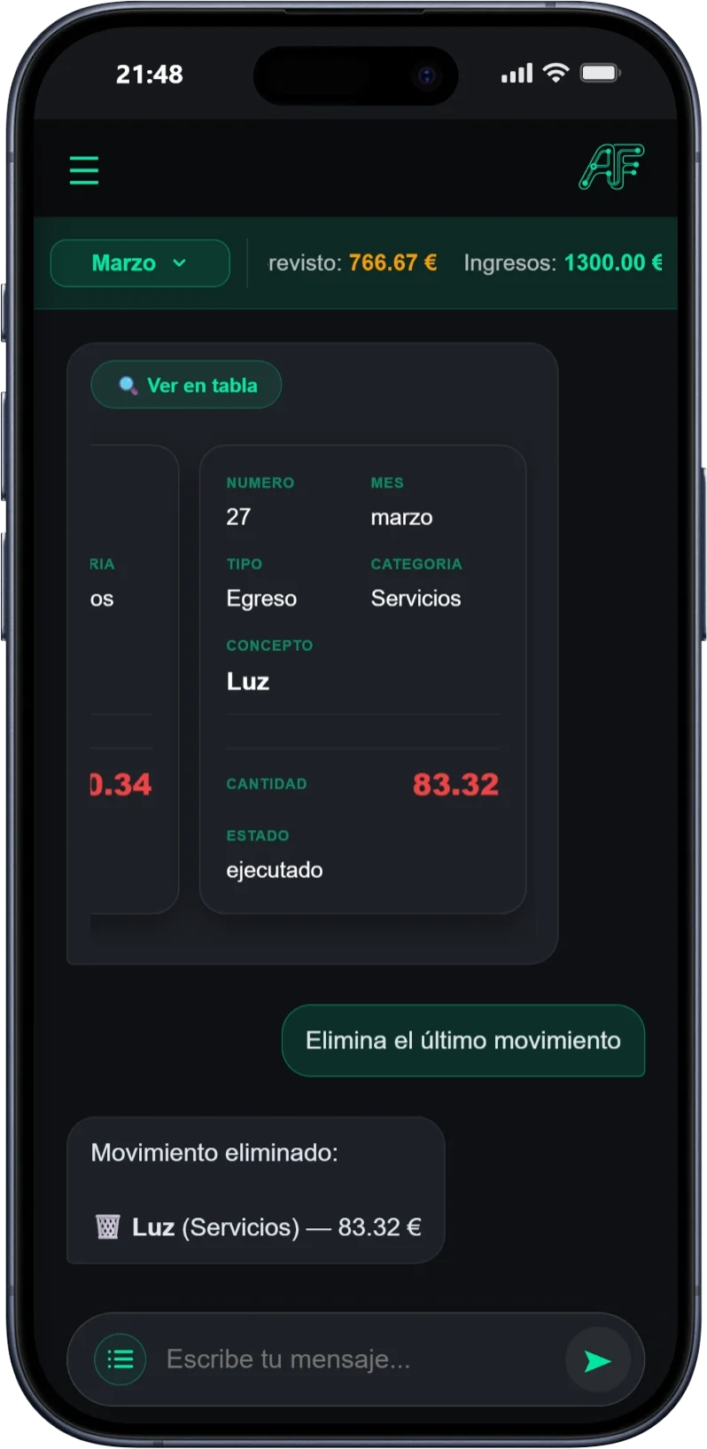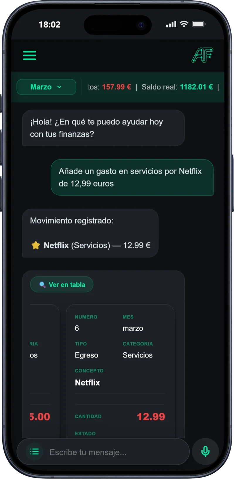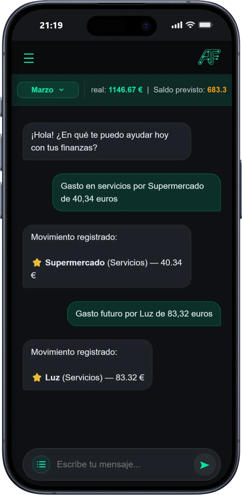 Tu asistente IA entiende lo que dices en lenguaje natural y añade tus gastos e ingresos al instante.