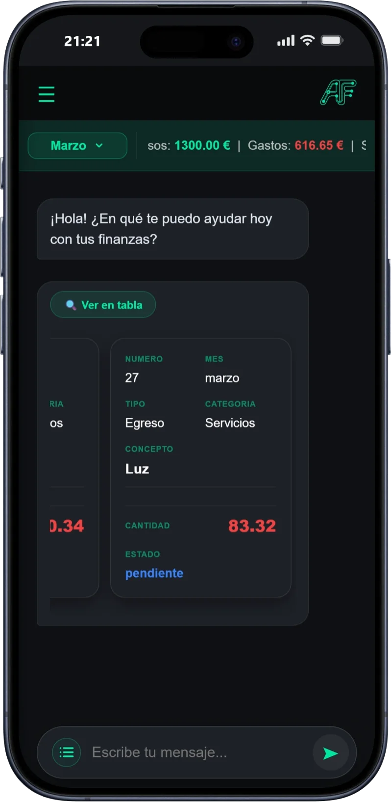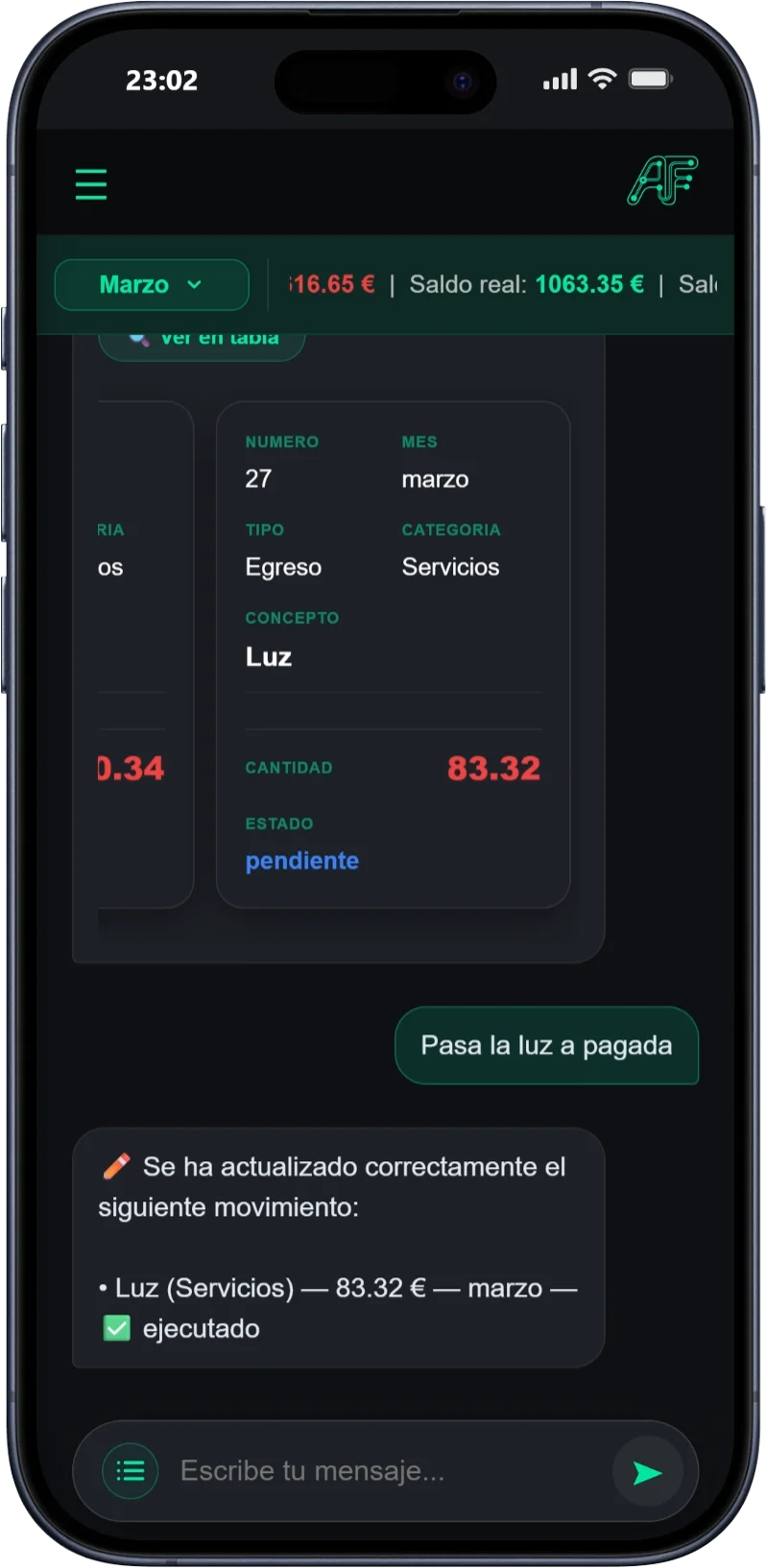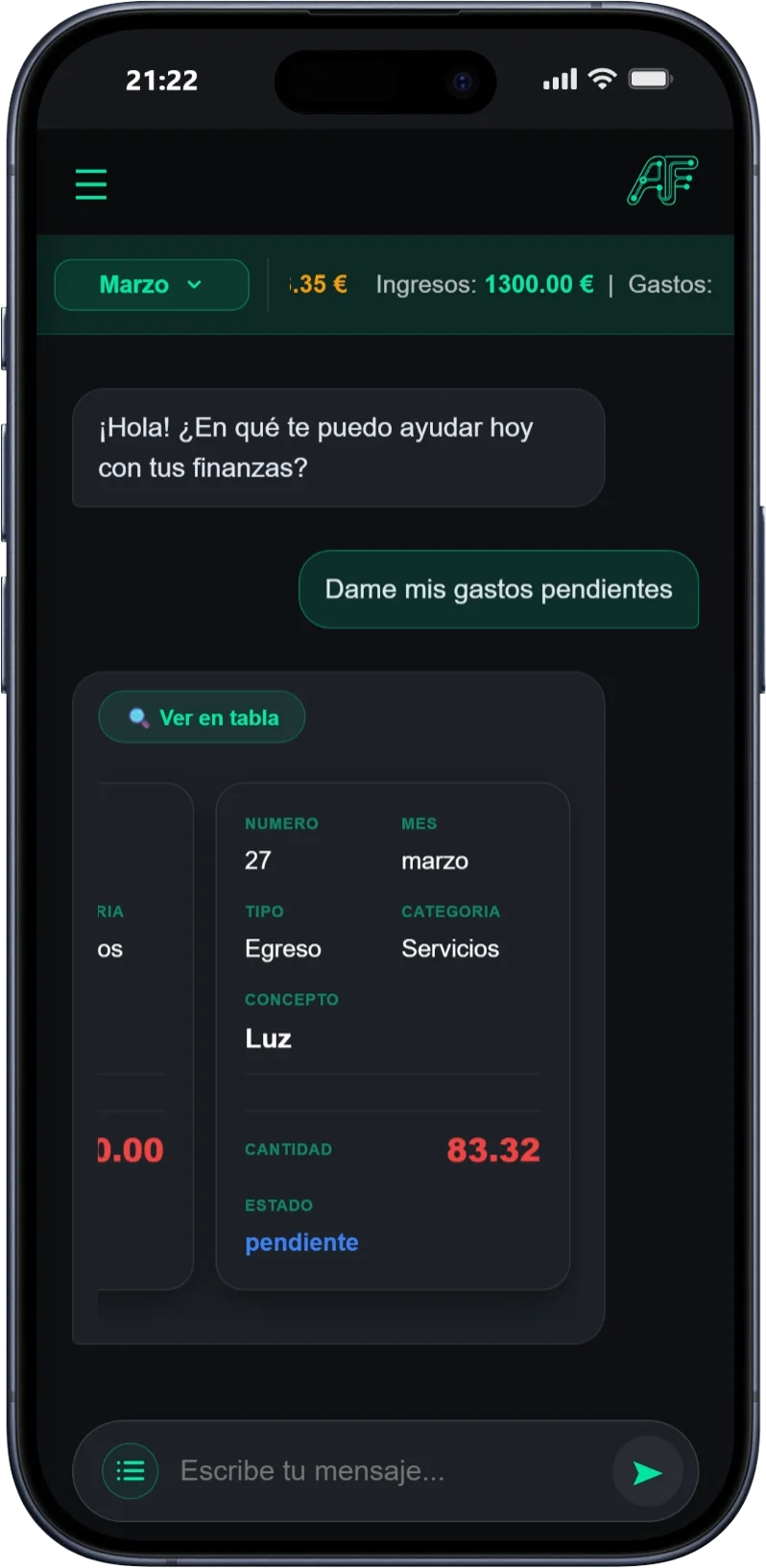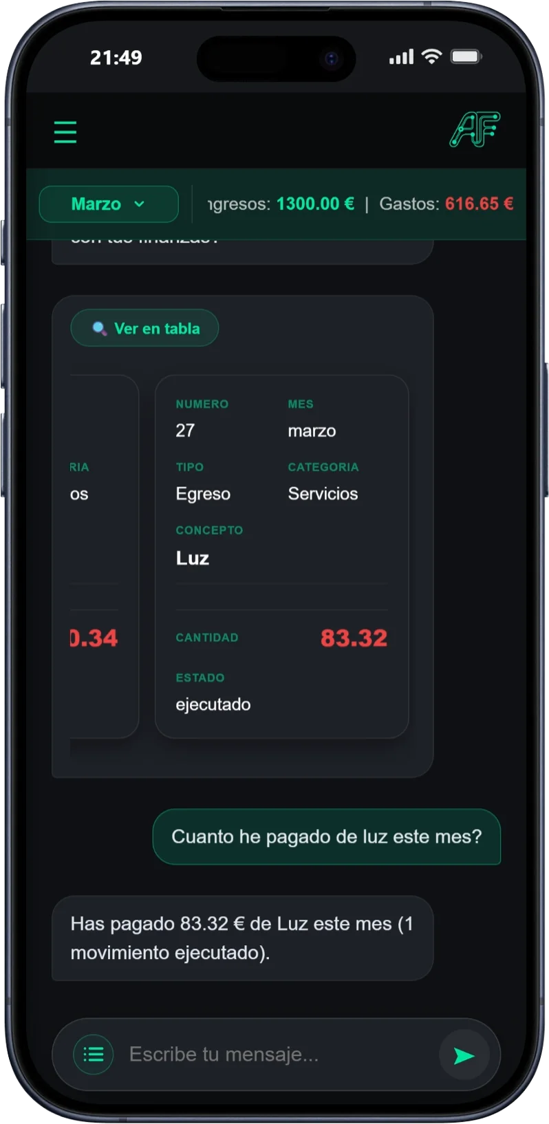 Tu asistente IA entiende lo que dices en lenguaje natural y añade tus gastos e ingresos al instante.